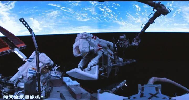 這是2025年6月26日在北京航天飛行控制中心屏幕上拍攝的神舟二十號(hào)航天員陳冬(左)與陳中瑞在空間站組合體艙外工作的畫(huà)面。新華社發(fā)(周柯毅 攝)